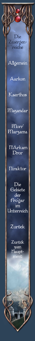 Chaorbror, Tvayryer Kovat und Tvarytreskot sind die größten und am dichtesten besiedelten Städten der Dunkelzwerge. Alleine in Chaorbror leben ungefähr 5000 Fro'gar. Mazandor, Kesdorok, Semyer Valdor (das Siebte Bollwerk), Varrdhûr an der Borborron (Rote Wehr), Qeylenktor (die Weinende Tiefe – eine Höhle irgendwo entlang des Flusses der sieben Fälle mit einem riesigen Wasserfall, der mehrere hundert Schritt tief in die Dunkelheit stürzt), Shirokkryk und Khortomrazryv (die Klagekluft) sind mittlere bis kleinere Höhlenanhäufungen, beziehungsweise Siedlungen, die sich über den ganzen noch begehbaren nordöstlichen und nordwestlichen Teil des Unterreichs verteilen.